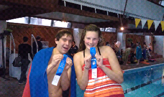 Senior swimmers Nick Ramos and Ellie Nebraska shown posing with their 1st place ribbons. Nick won the 500 and Ellie the mile at the Katy Callard Memorial.